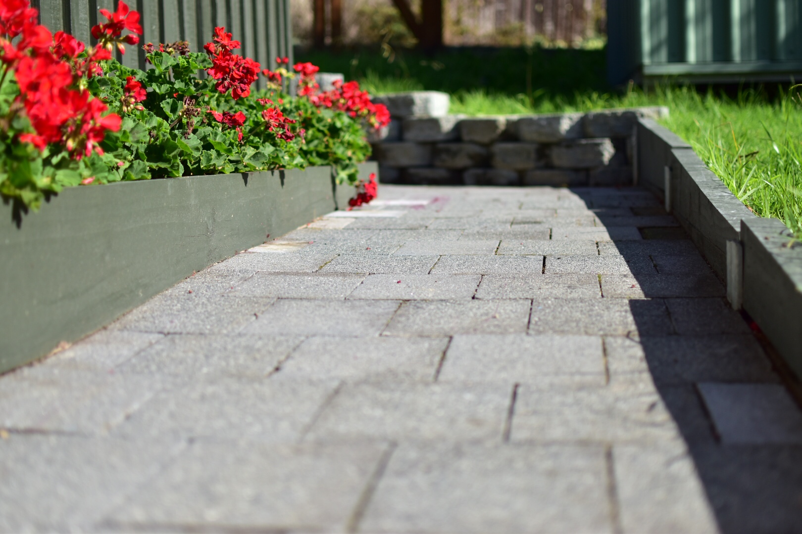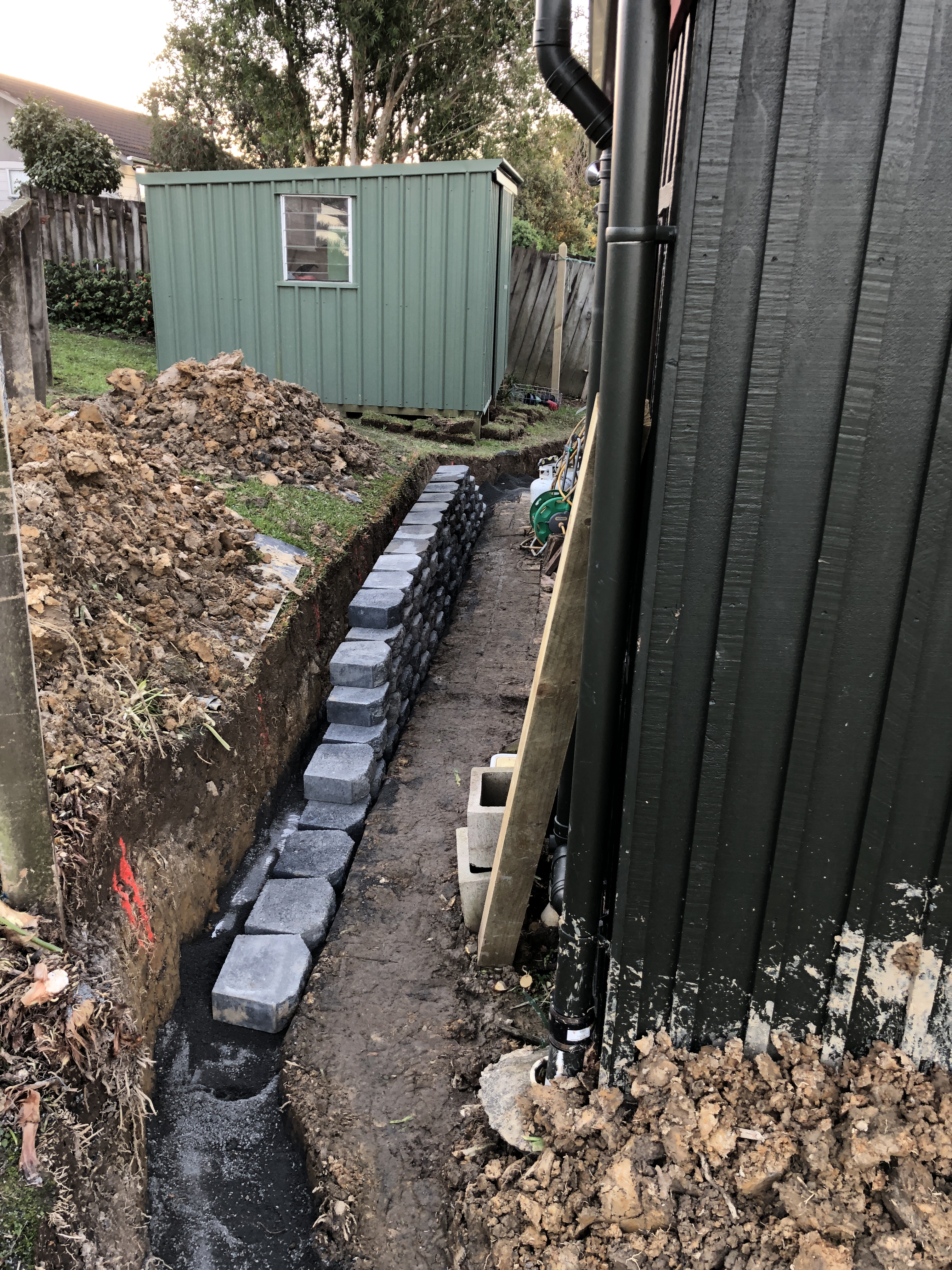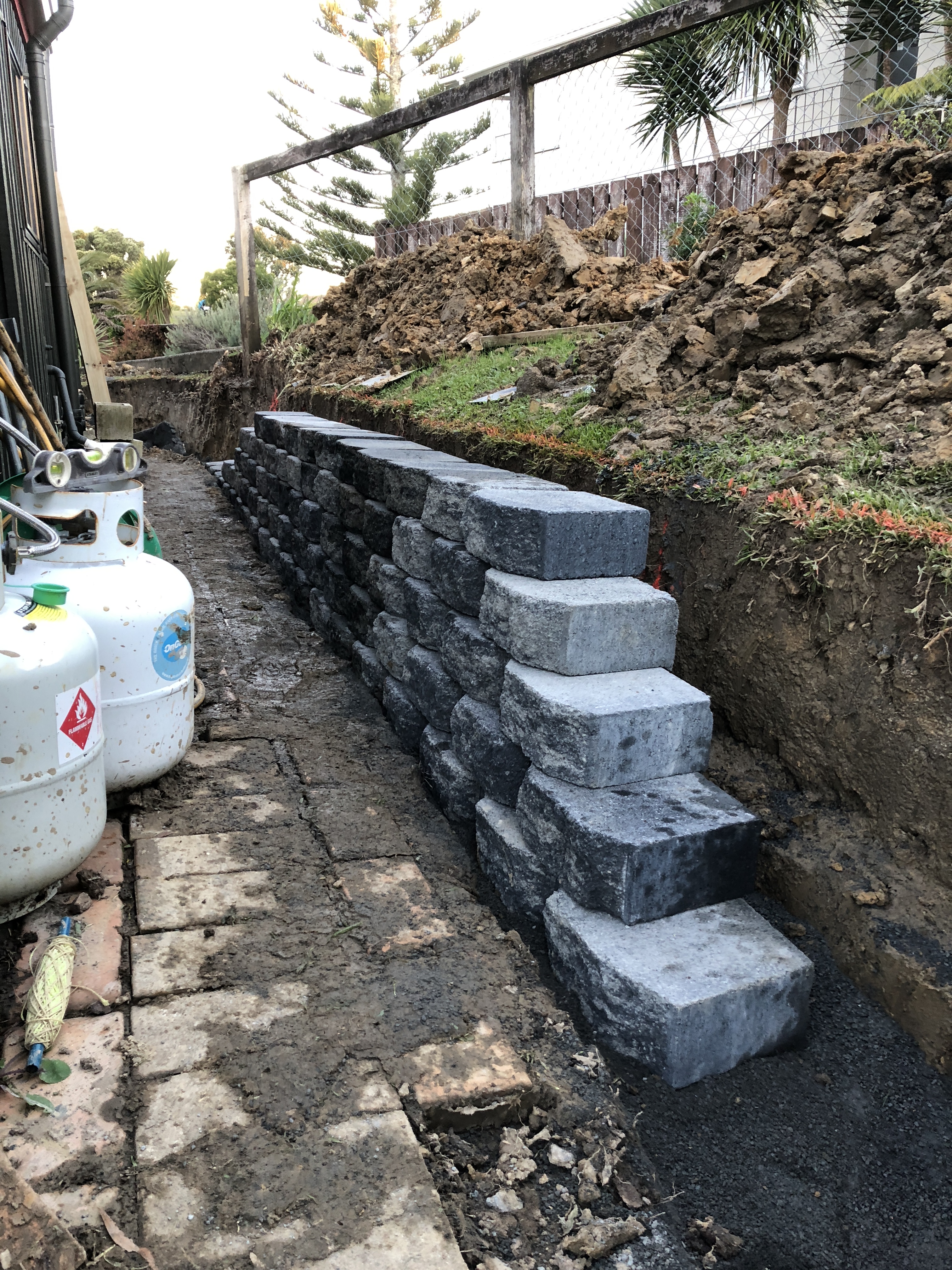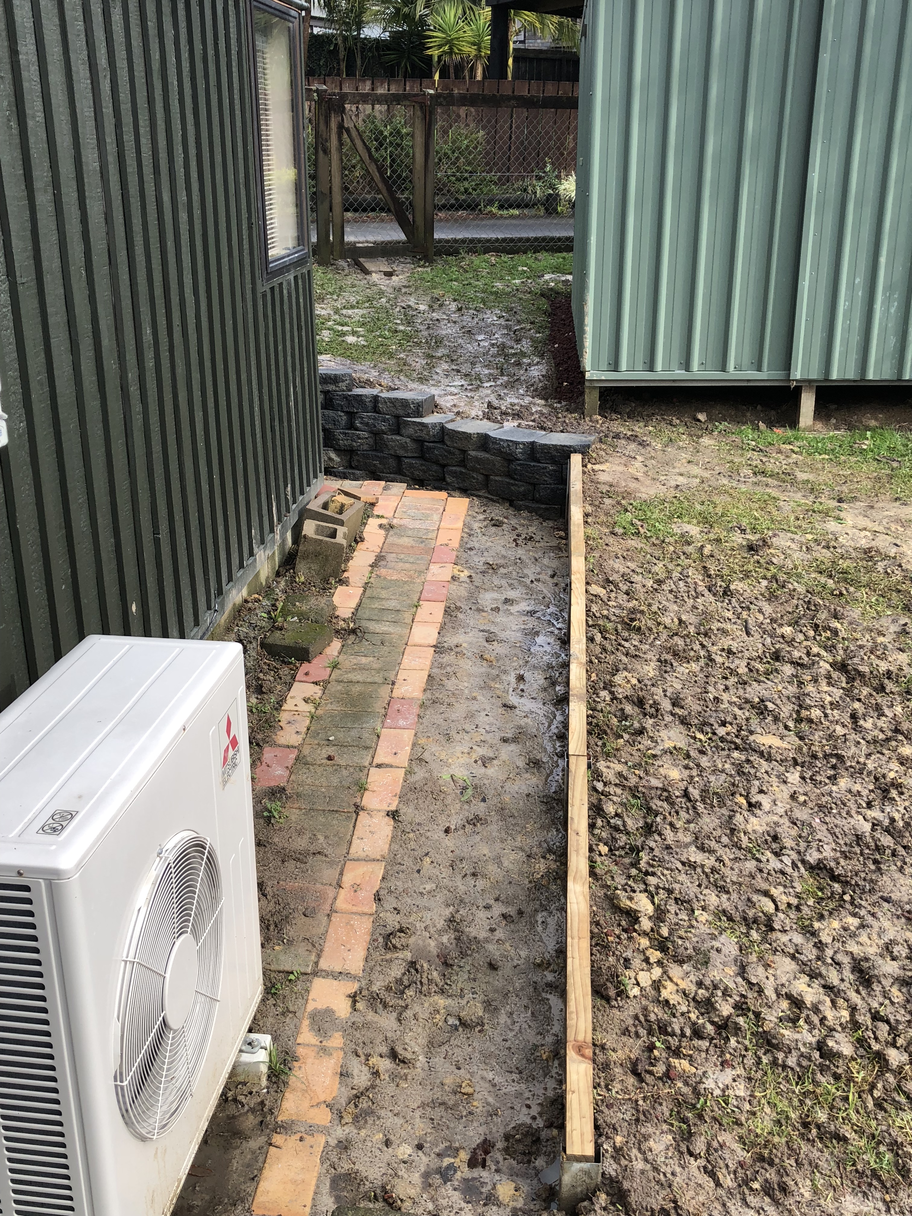 This cobbled pathway is behind the house, the back door is also on this side of the house. The ground above the pathway had previously been a slope with no drainage; the pathway would often flood in winter and sometimes water would flood into the laundry through the back door. The as-built drainage plans from the property bag had shown existing drainage from the toilet that ran the width of the house and was not within safe distance to allow concreting in posts for a timber retaining wall. Hence the owner elected for a block retaining wall. To prevent future flooding of the pathway, drainage coil has been installed at several different heights along the back of the wall.