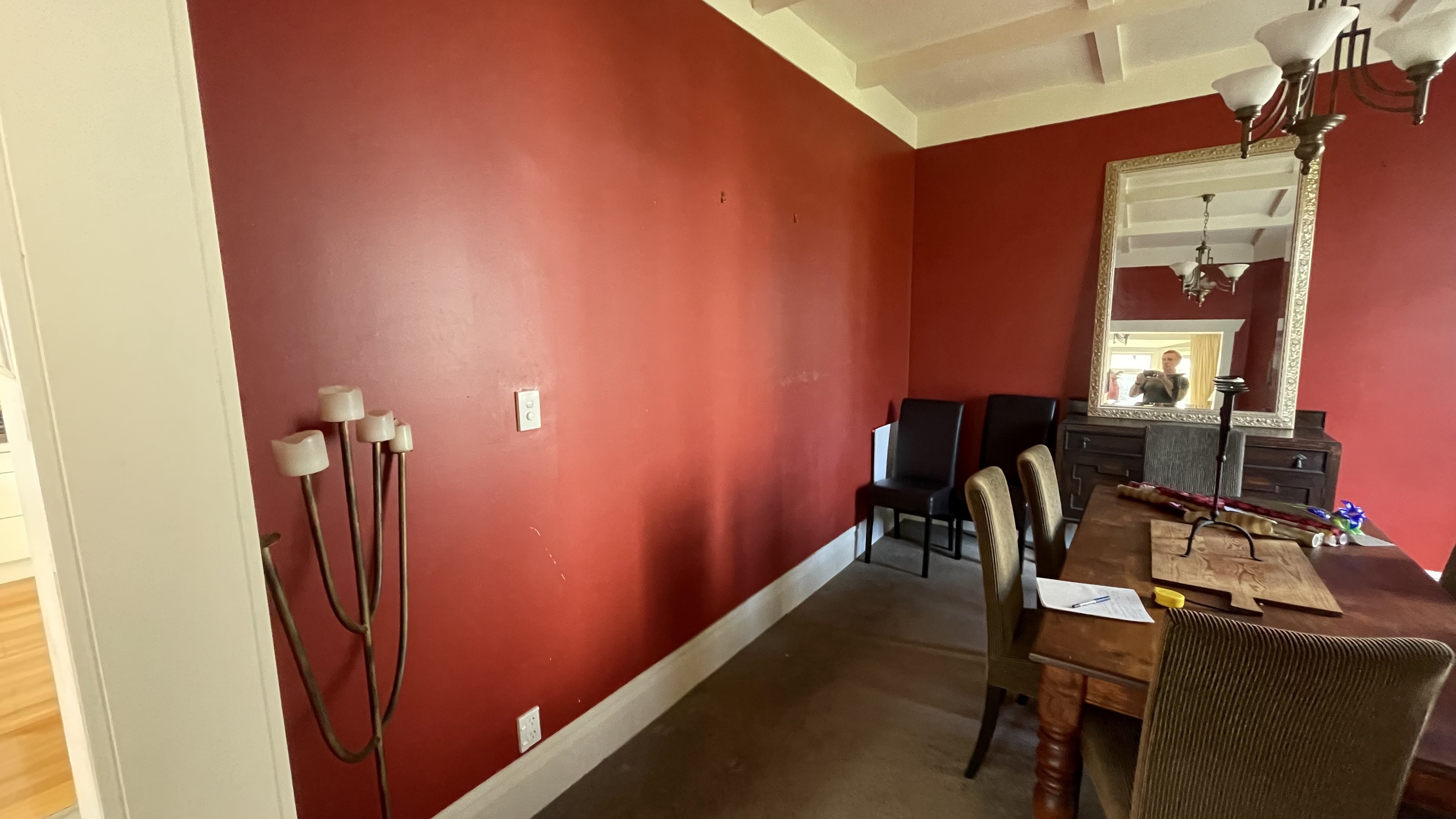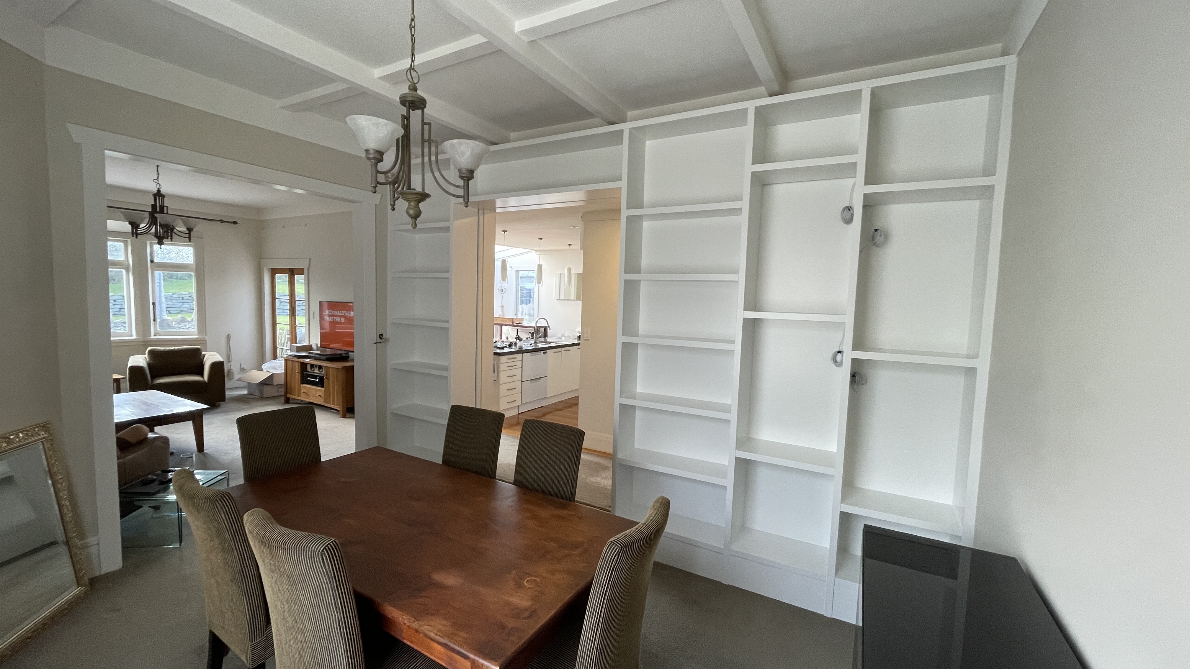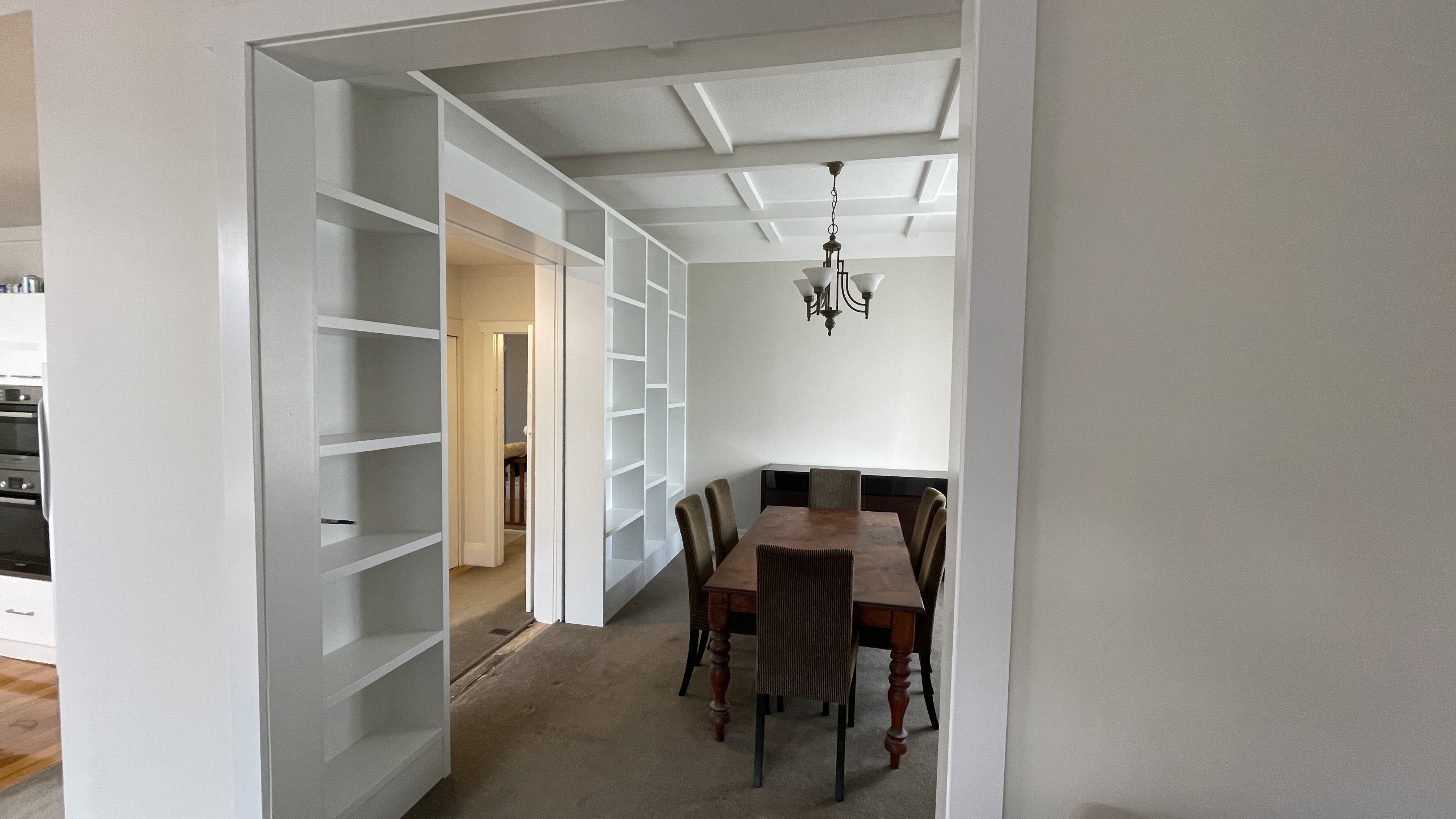 The before and after show what a difference a bit of clever design can make. This was a dark dining area that was not enjoyed or used by the family. But re-painting and adding a custom bookcase (with hidden doors), as well as opening the room up to the kitchen and living area, they now have a gorgeous and functional dining area they will truly enjoy.